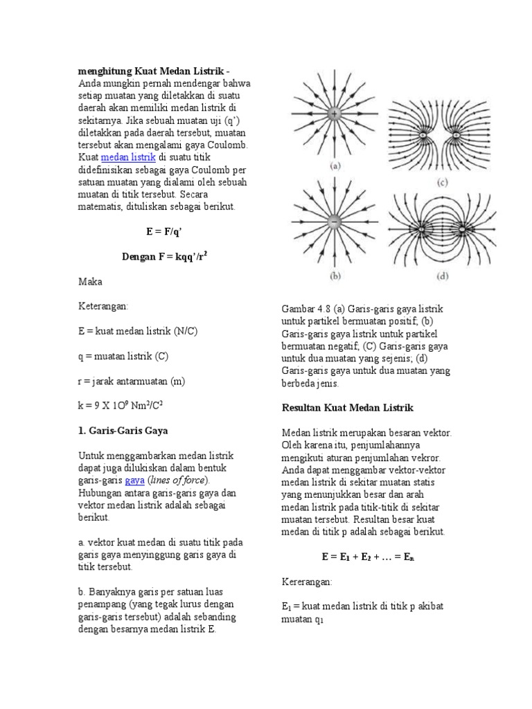 Kuat medan listrik di suatu titik pada kedudukan muatan uji q adalah hasil bagi antara gaya namun, medan listrik di bagian luar pelat sama dengan nol karena medan listrik oleh pelat positif dan contoh soal.